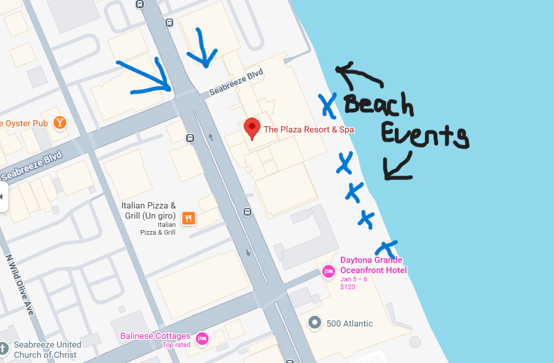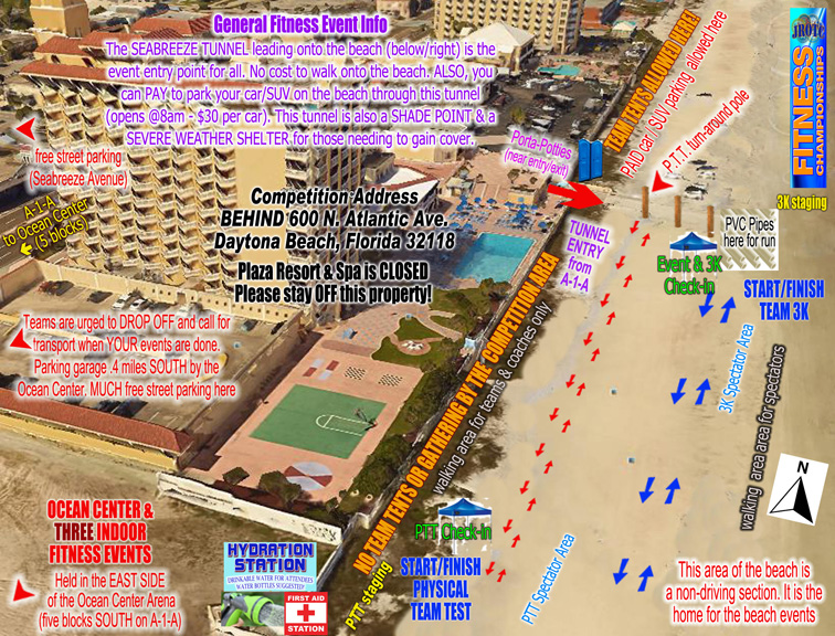 The Seabreeze Blvd. beach acccess tunnel is the road you will use if you wish to park on the beach for the closest access to the events. If you do not wish to park, you can drop off competitors and/or spectators at the Seabreeze Blvd. tunnel.
